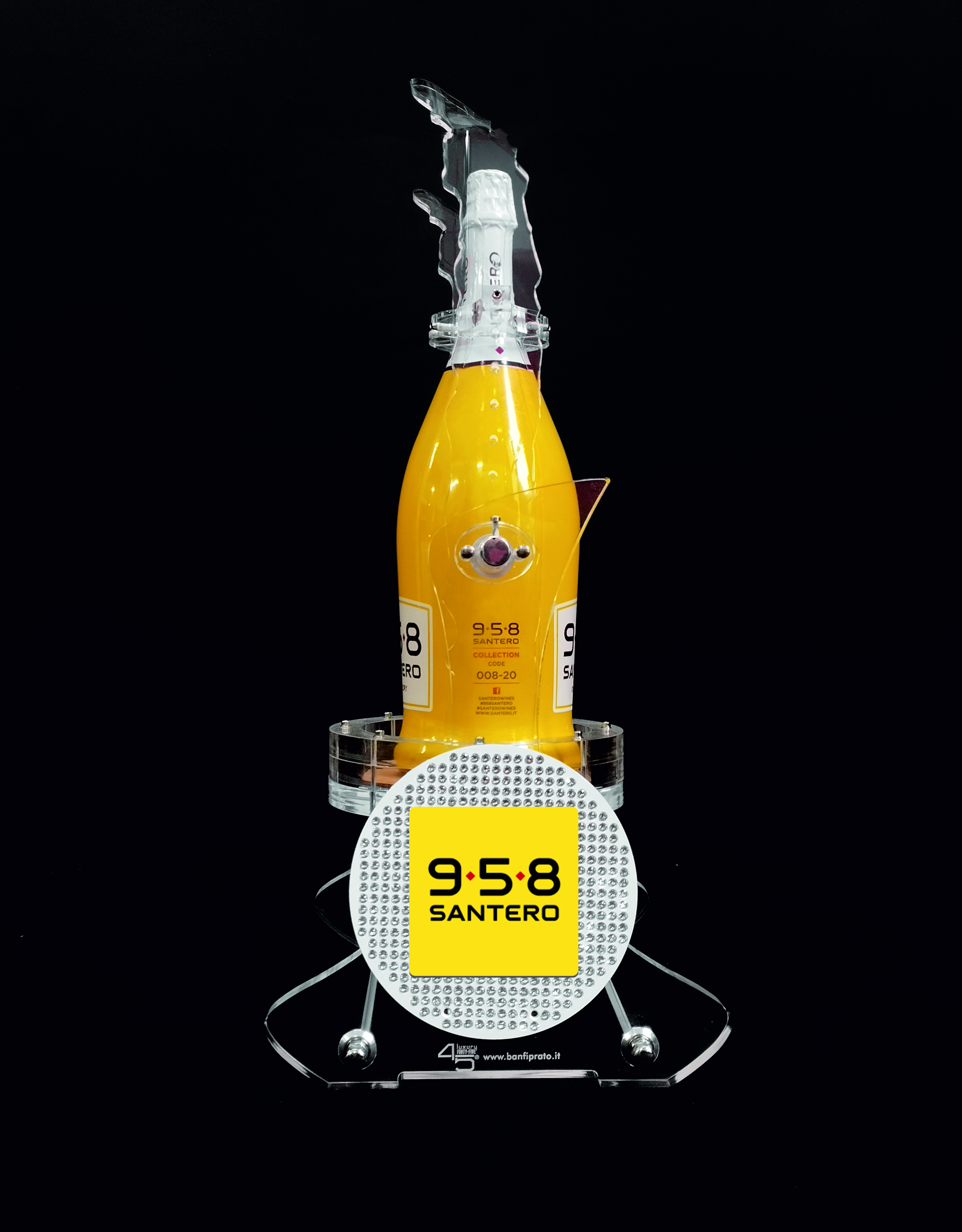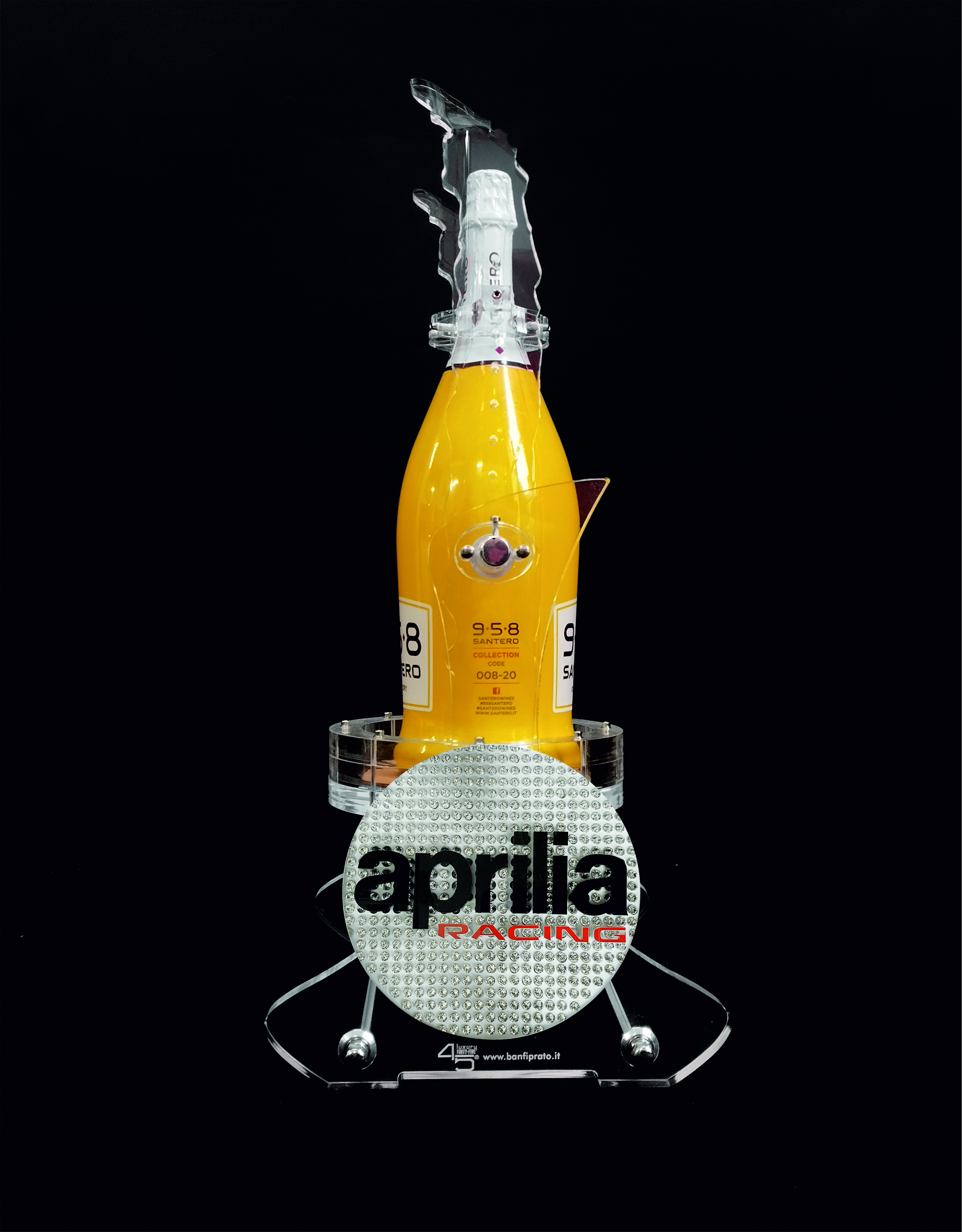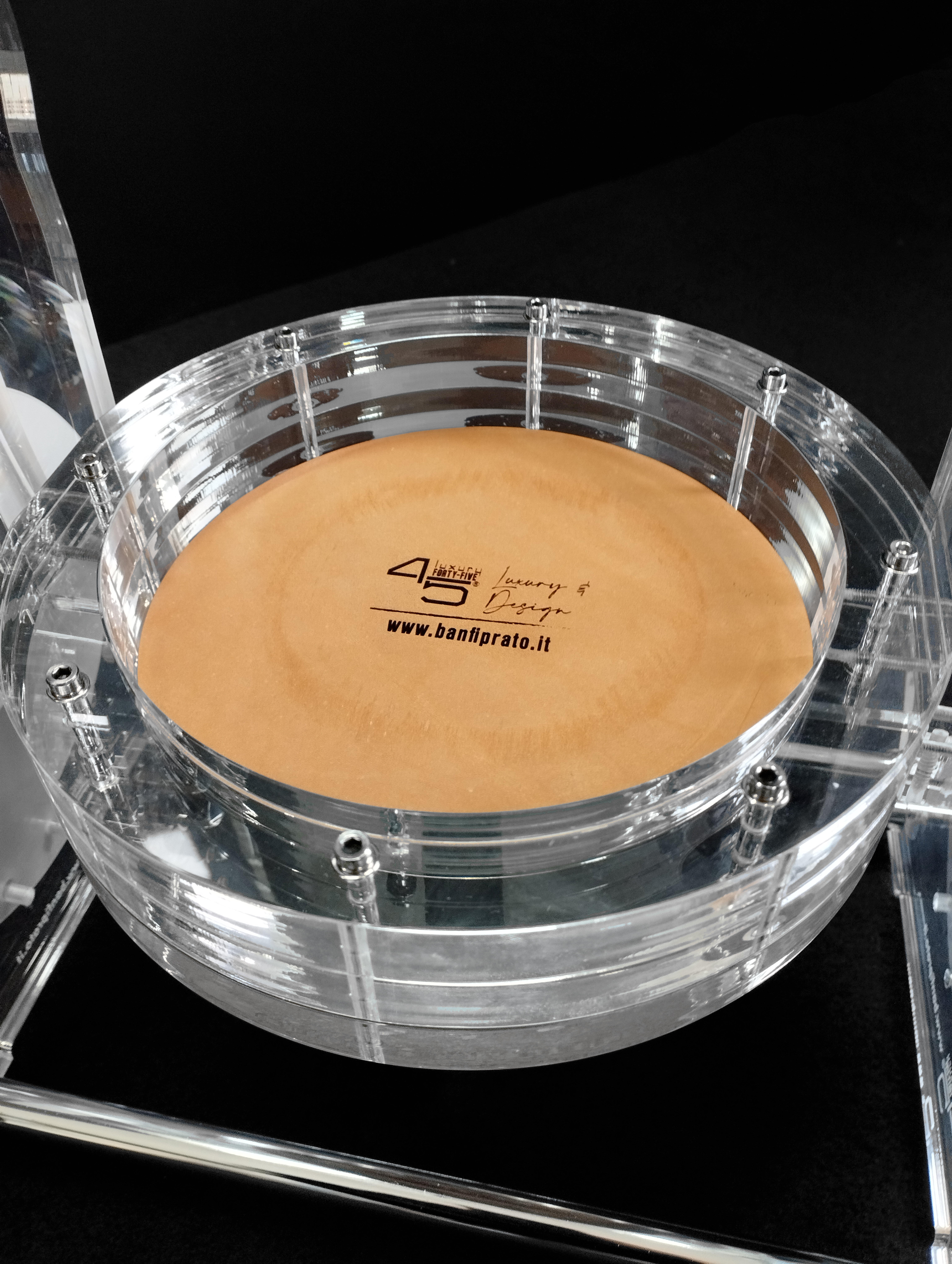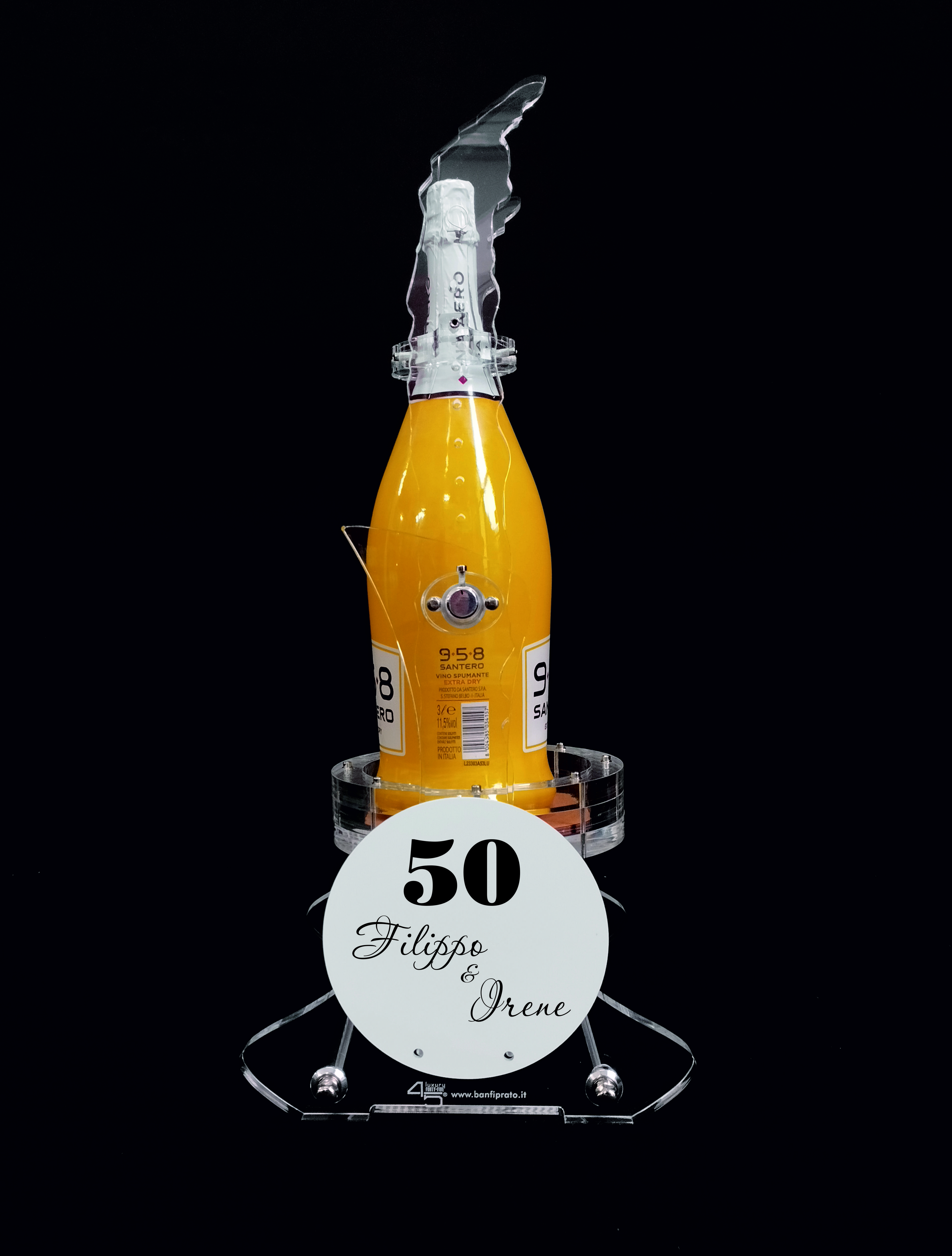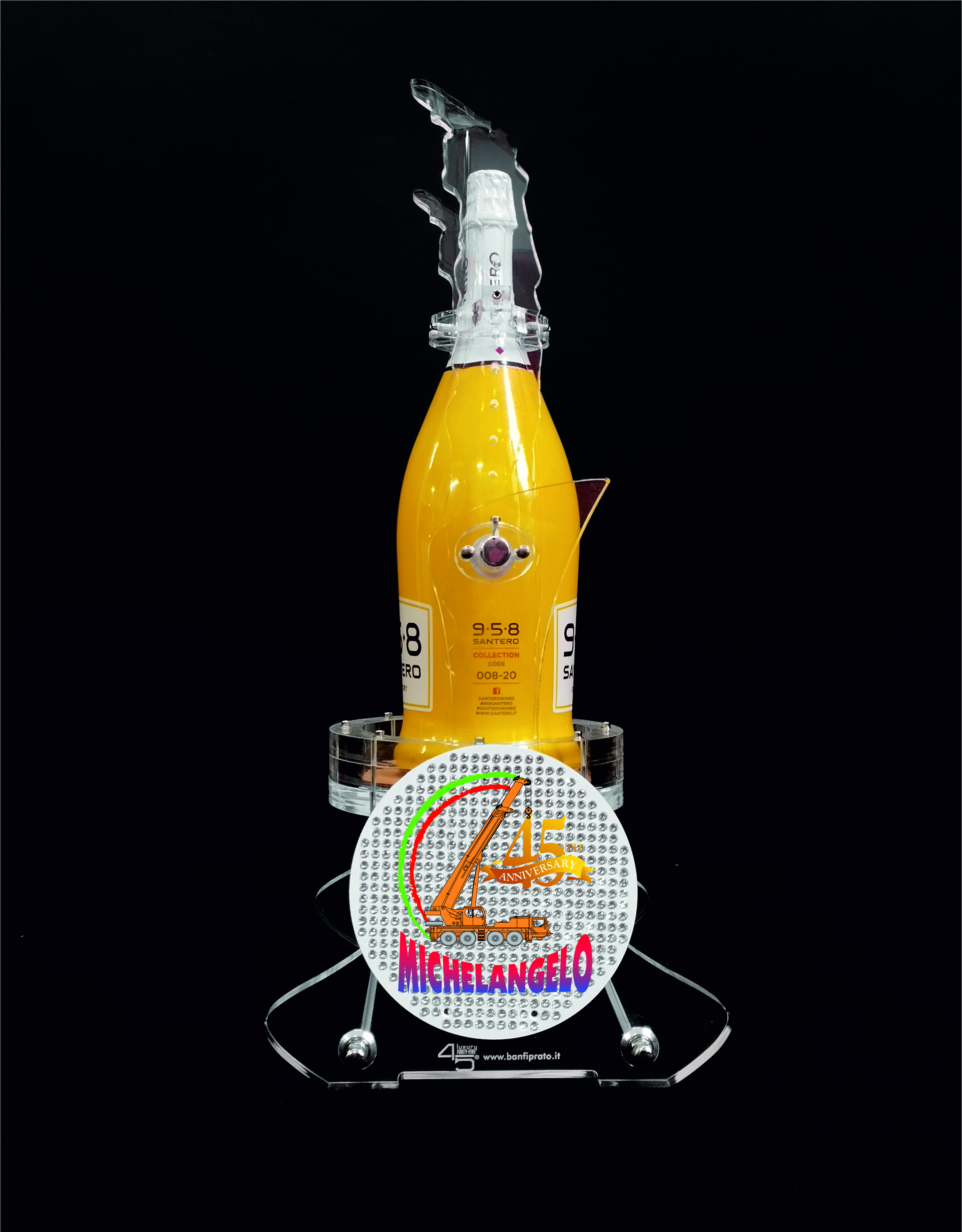 Su ognuno dei 2 lati del versatore sono installati 2 supporti personalizzabili, su supporto plexiglass colorato e arricchiti di cristalli swarovski, con scritte o loghi aziendali.