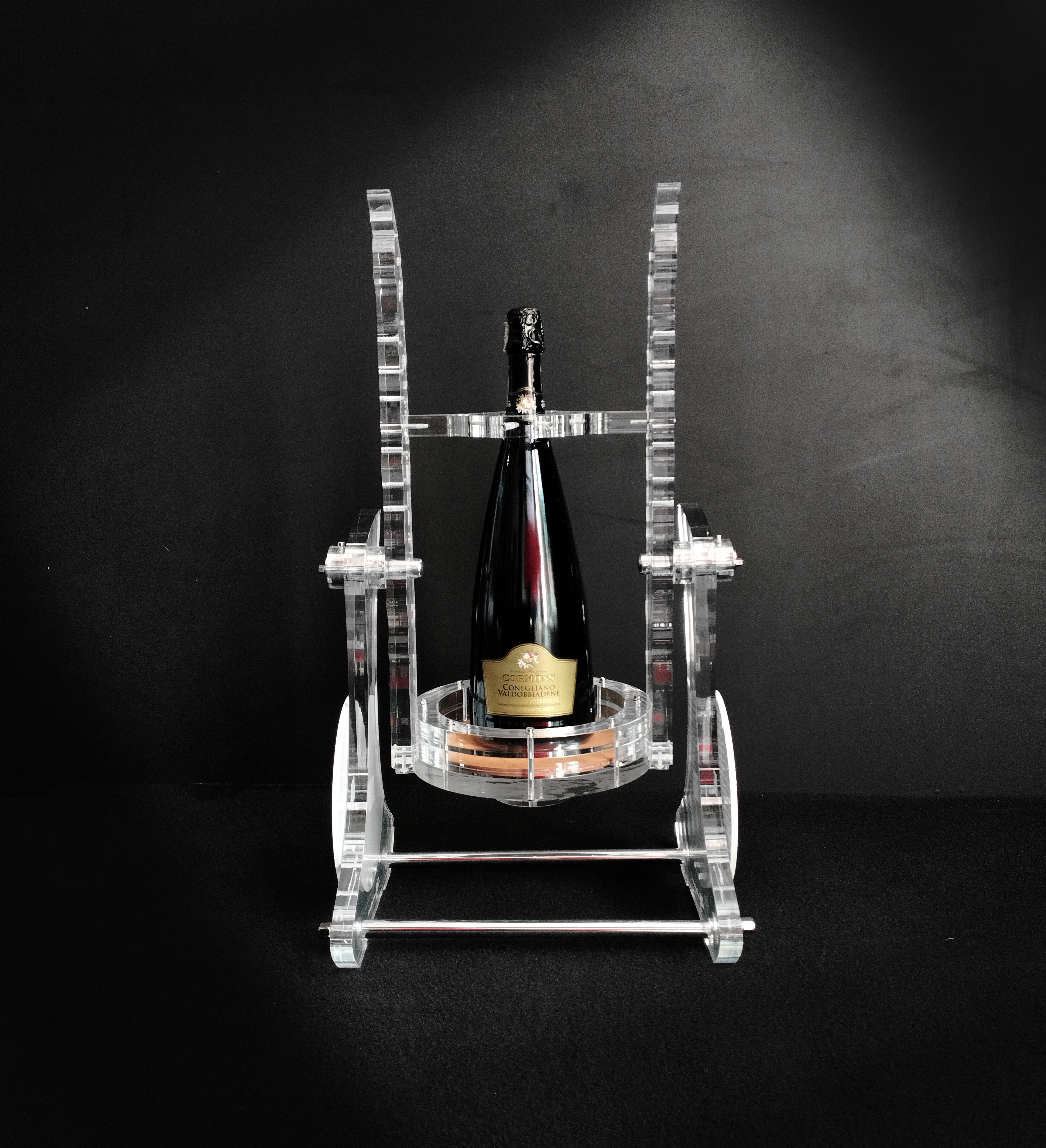 Elegante e Moderno Versatore 2.0 dal Design Unico, realizzato in Plexiglass Spessore 20 mm con finiture cromate, sul quale possono essere collocate e intercambiate facilmente, grazie ad un pratico sistema di bloccaggio, vari formati di bottiglie da 1,5 fino a 3 litri.